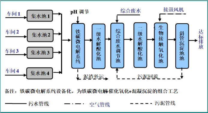 各類生產線的廢水進行單獨收集,之后統一送入初調節池中進行水質的調節,;預處理采用“鐵碳微電解+催化氧化+混凝沉淀”工藝,沉淀溢流到一級水解酸化池中,之后流入到綜合調節池中,與生活污水、清潔下水混合后,送入二級水解酸化池,水解后出水至生物接觸氧化池中進行好氧處理,處理后水進入沉淀池中,上清液排放。