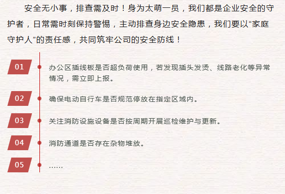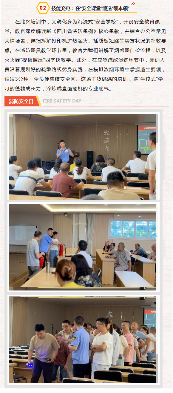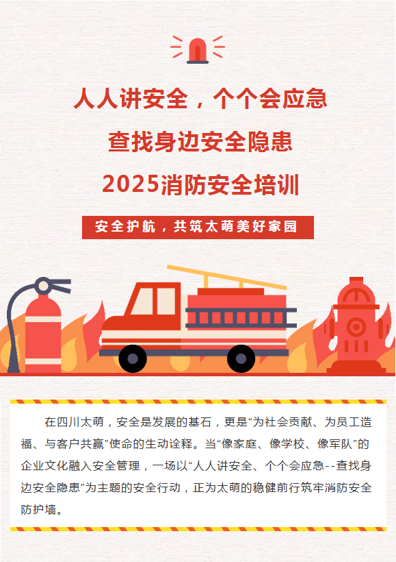 【概要描述】在四川太萌,安全是發展的基石,更是“為社會貢獻、為員工造福、與客戶共贏”使命的生動詮釋。當“像家庭、像學校、像軍隊”的企業文化融入安全管理,一場以“人人講安全、個個會應急--查找身邊安全隱患”為主題的安全行動,正為太萌的穩健前行筑牢消防安全防護墻。